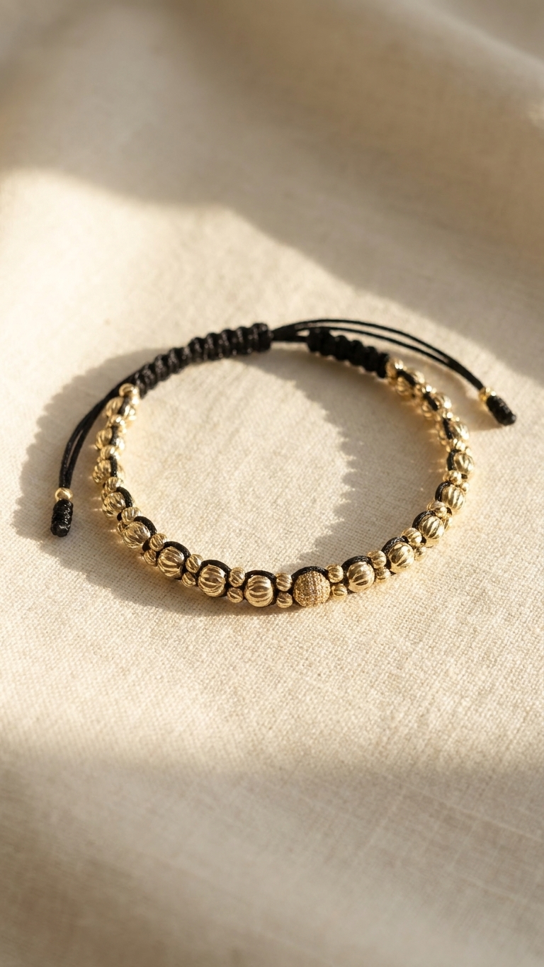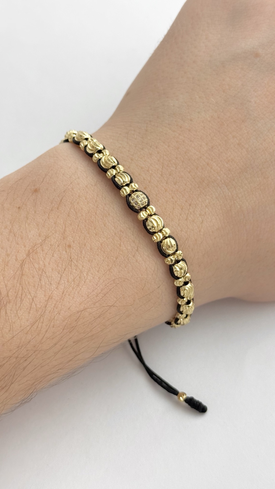 Tres capas de oro laminado 18k sobre base antialérgica. El nudo corredizo del macramé se ajusta a cualquier muñeca. Cinco años de garantía NJL.