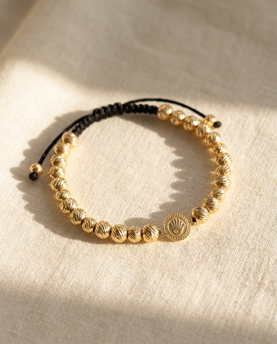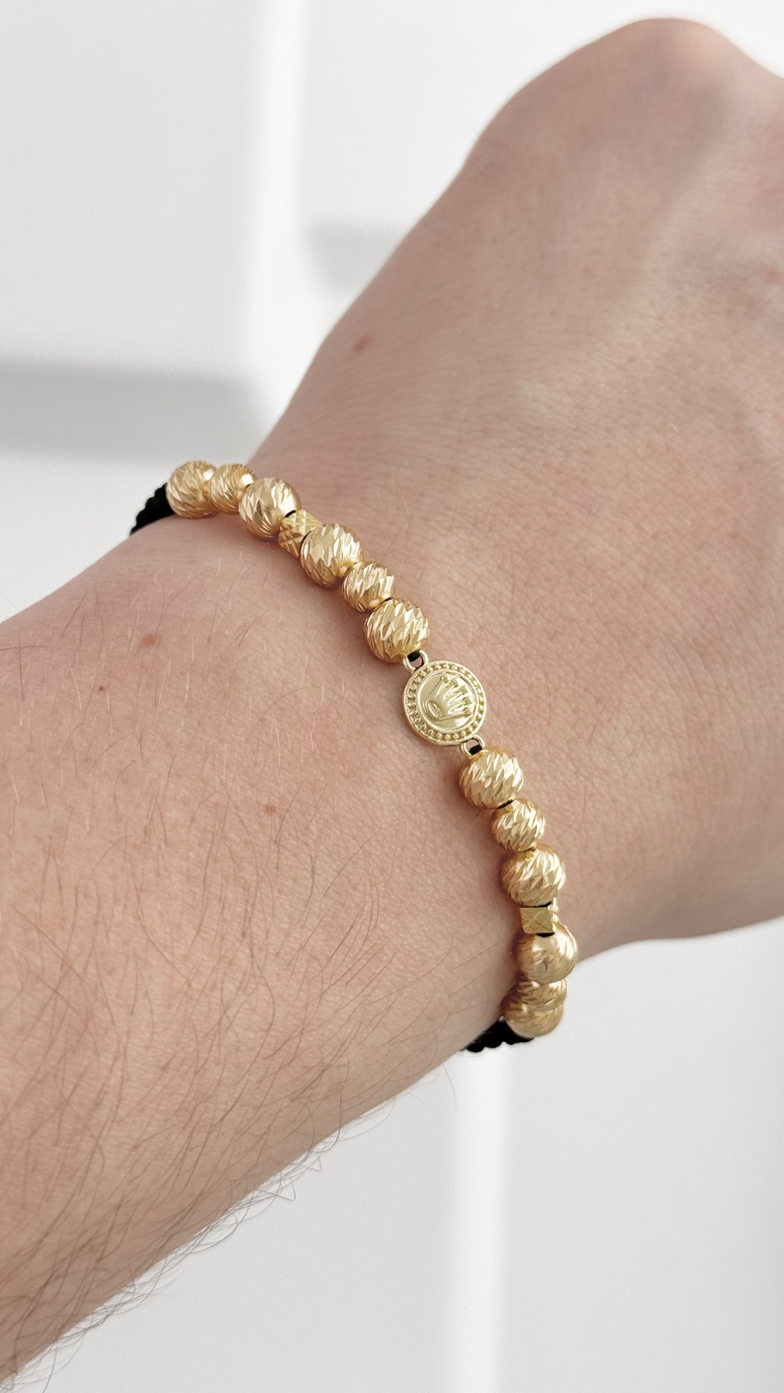 Balines diamantados de 6mm tejidos sobre macramé negro con una medalla redonda en oro 18k como punto focal. Una pulsera con peso y carácter, pensada para quienes buscan una pieza con personalidad propia.