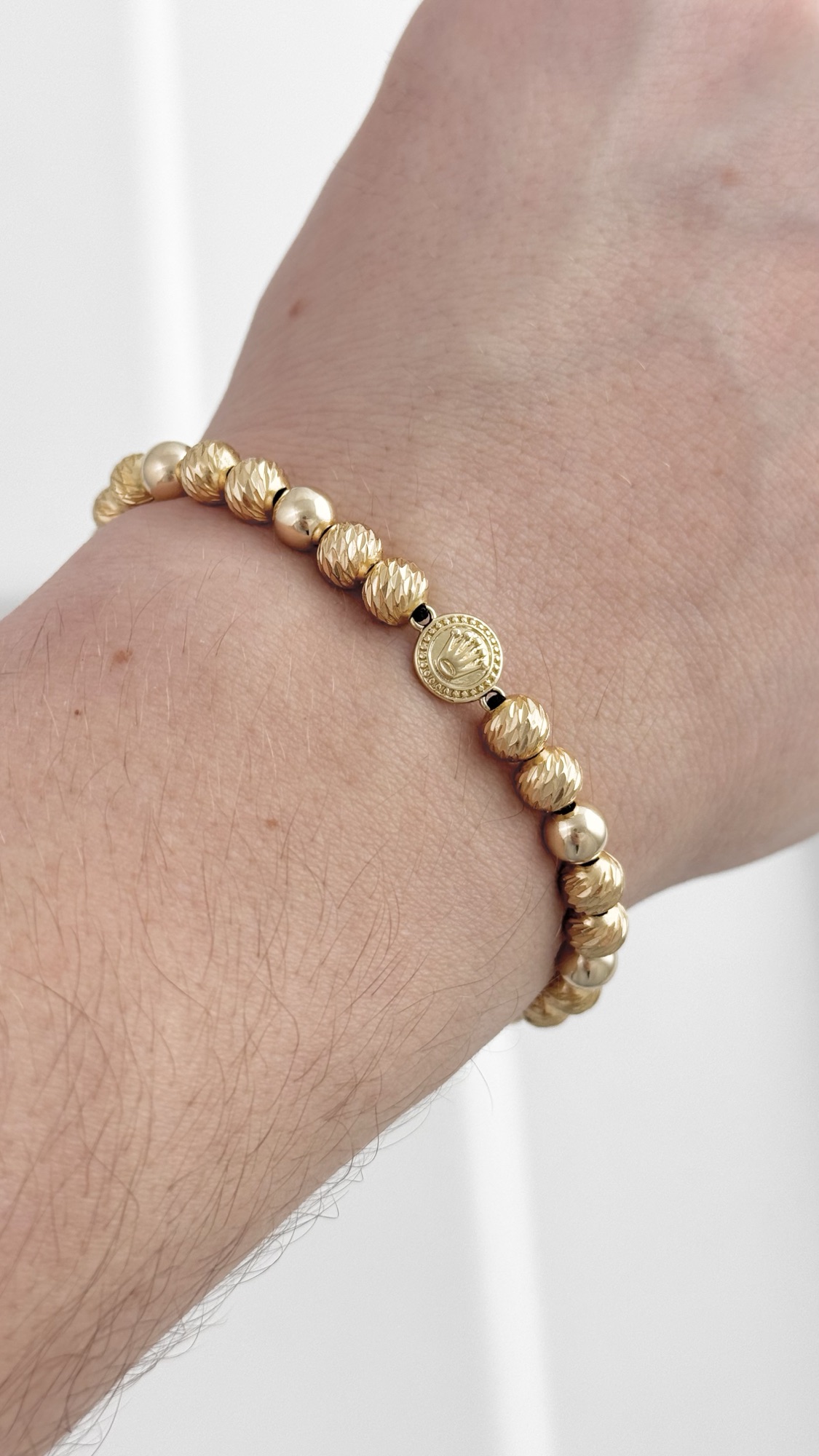 La versión premium de nuestra pulsera con sello: balines diamantados más gruesos, sin cordón visible y una medalla redonda con grabado central. Mayor peso visual, mismo concepto refinado.