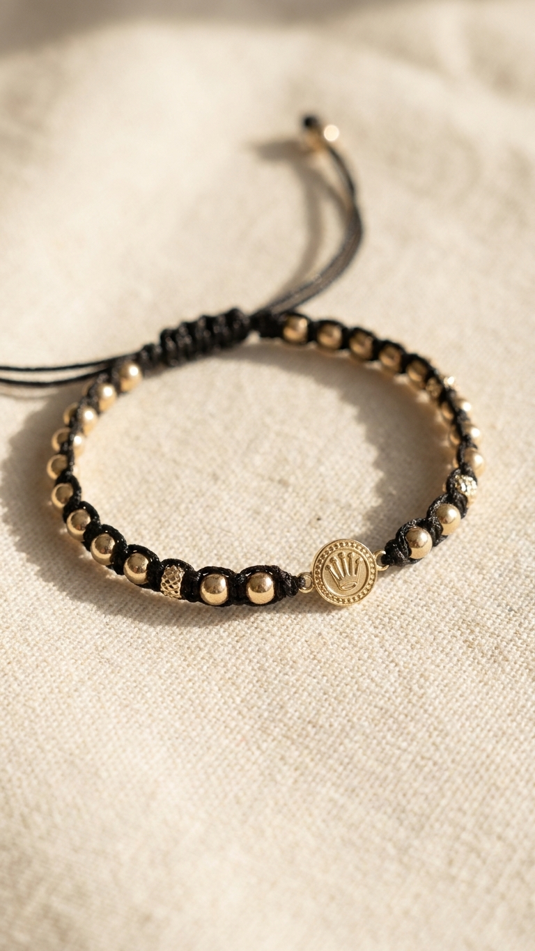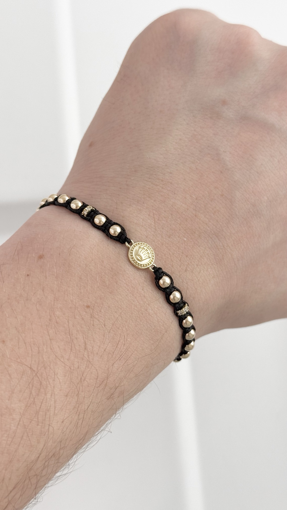 Macramé negro tejido fino con balines de 4mm y una medalla con sello pequeña en el centro. Una pulsera con identidad pero sin la presencia exagerada: para quienes prefieren llevar el sello sin que sea el único protagonista.