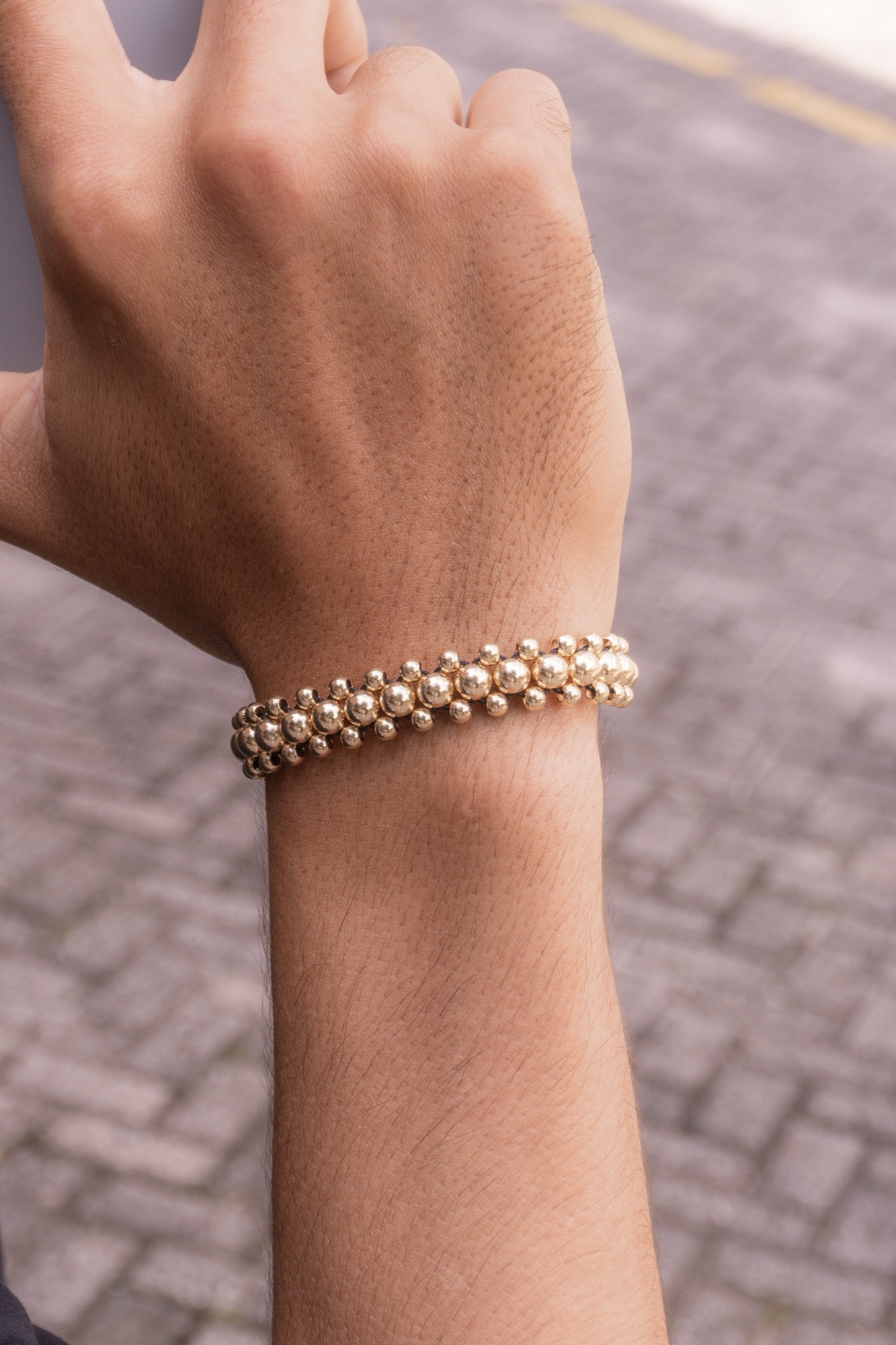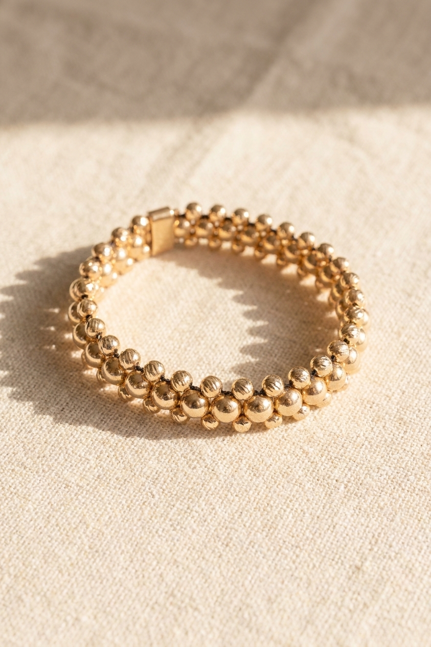 Tres carriles de balines lisos en oro laminado 18k, tejidos a mano para que cada hilera quede paralela y la pieza tenga la presencia de una joya seria. Sin cordón visible, solo balines puros.