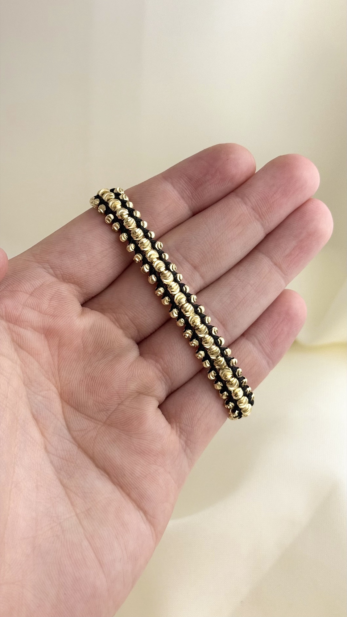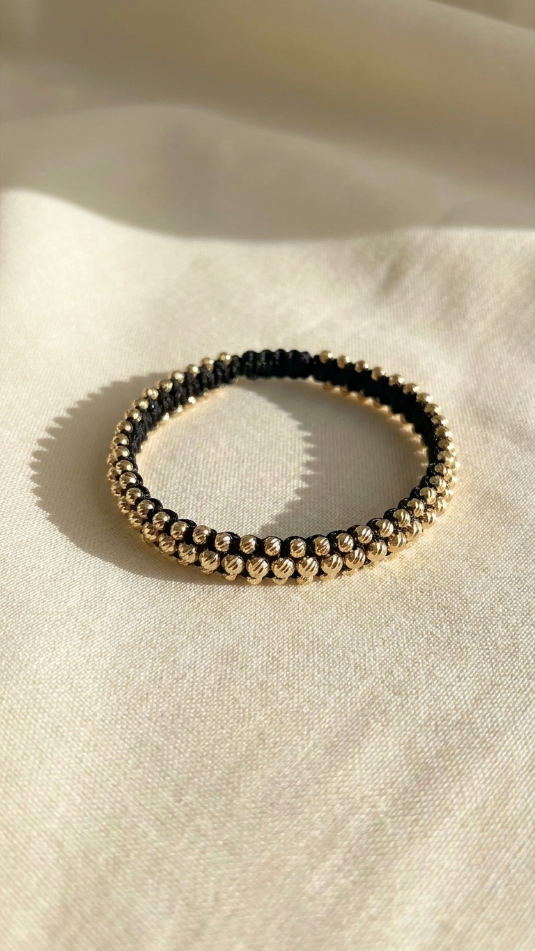 La pulsera más sustancial de la colección: tres hileras paralelas de balines diamantados tejidas en macramé negro. El conjunto tiene un grosor que se siente al ponerla y un brillo que se nota al moverla.