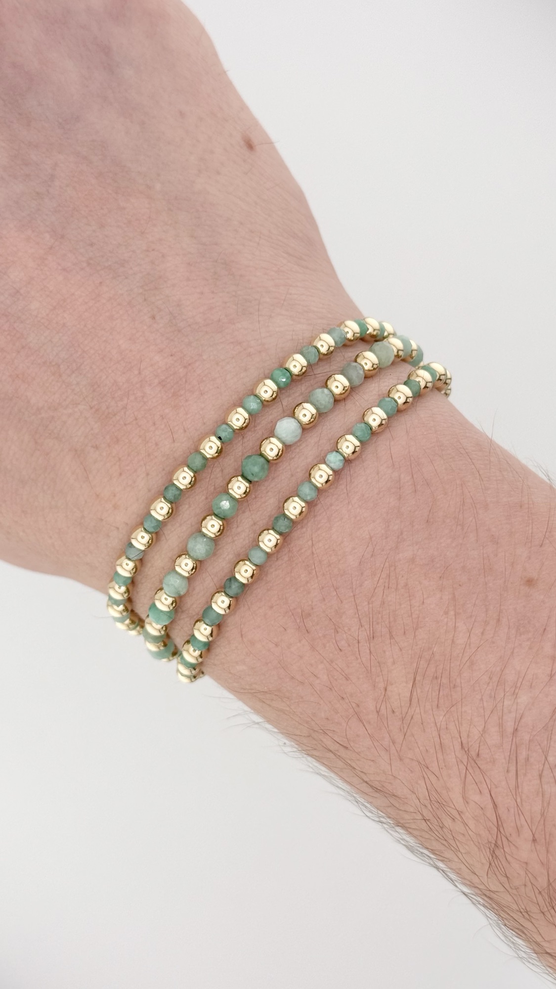 Tres pulseras finas que llegan armadas para usar juntas: piedras esmeralda mate combinadas con balines mini en oro laminado 18k. El set te ahorra el trabajo de elegir piezas que combinen porque ya están pensadas como un conjunto coherente.