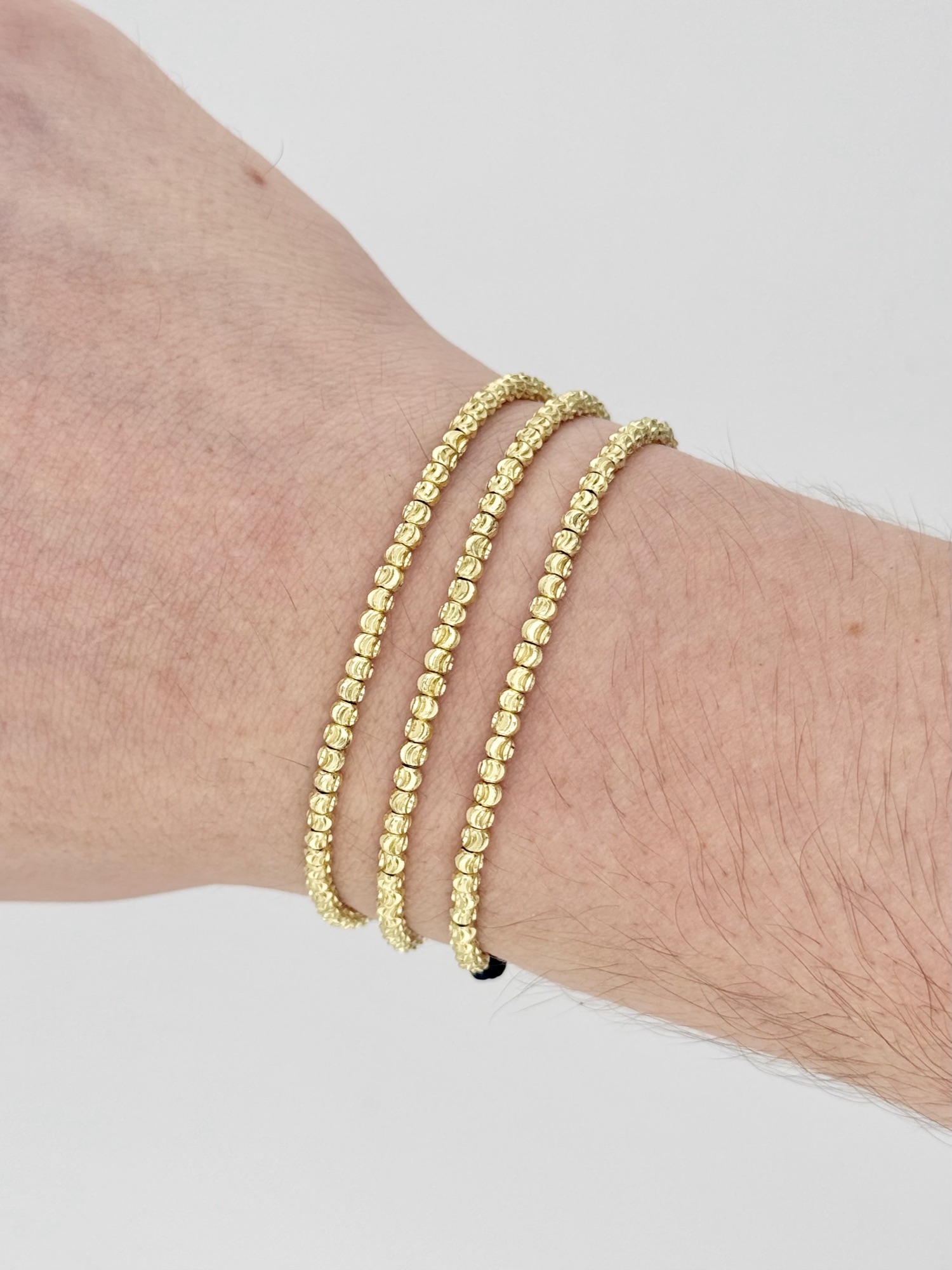 Tres pulseras finas de balines mini diamantados sin cordón visible. El conjunto crea esa textura de "tres líneas de oro" que se ve elegante en cualquier muñeca, masculina o femenina.